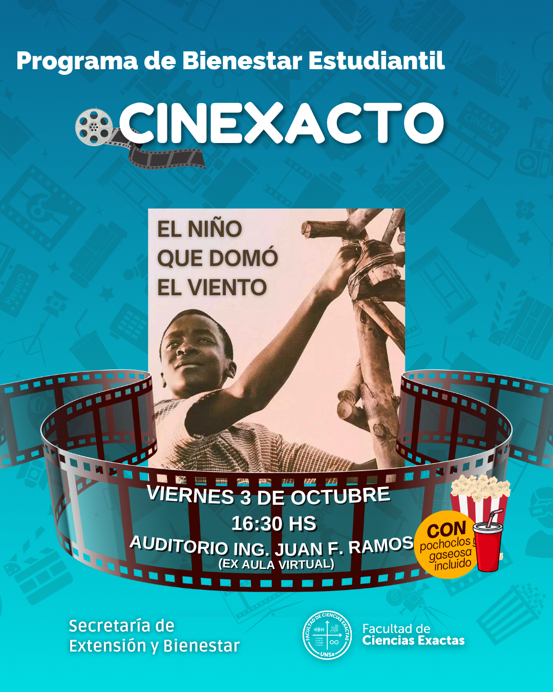 VUELVE EL CICLO DE CINE: CINEXACTO 2025 Te invitamos a participar del CINEXACTO 2025, el cual, vuelve a formar parte de nuestros viernes de distensión en la Facultad.  En esta ocasión, se proyectará la película: El niño que domó el viento.   Viernes 3 de octubre, a partir de las 16:30 hs.    Auditorio Ing. Juan Francisco Ramos - E...