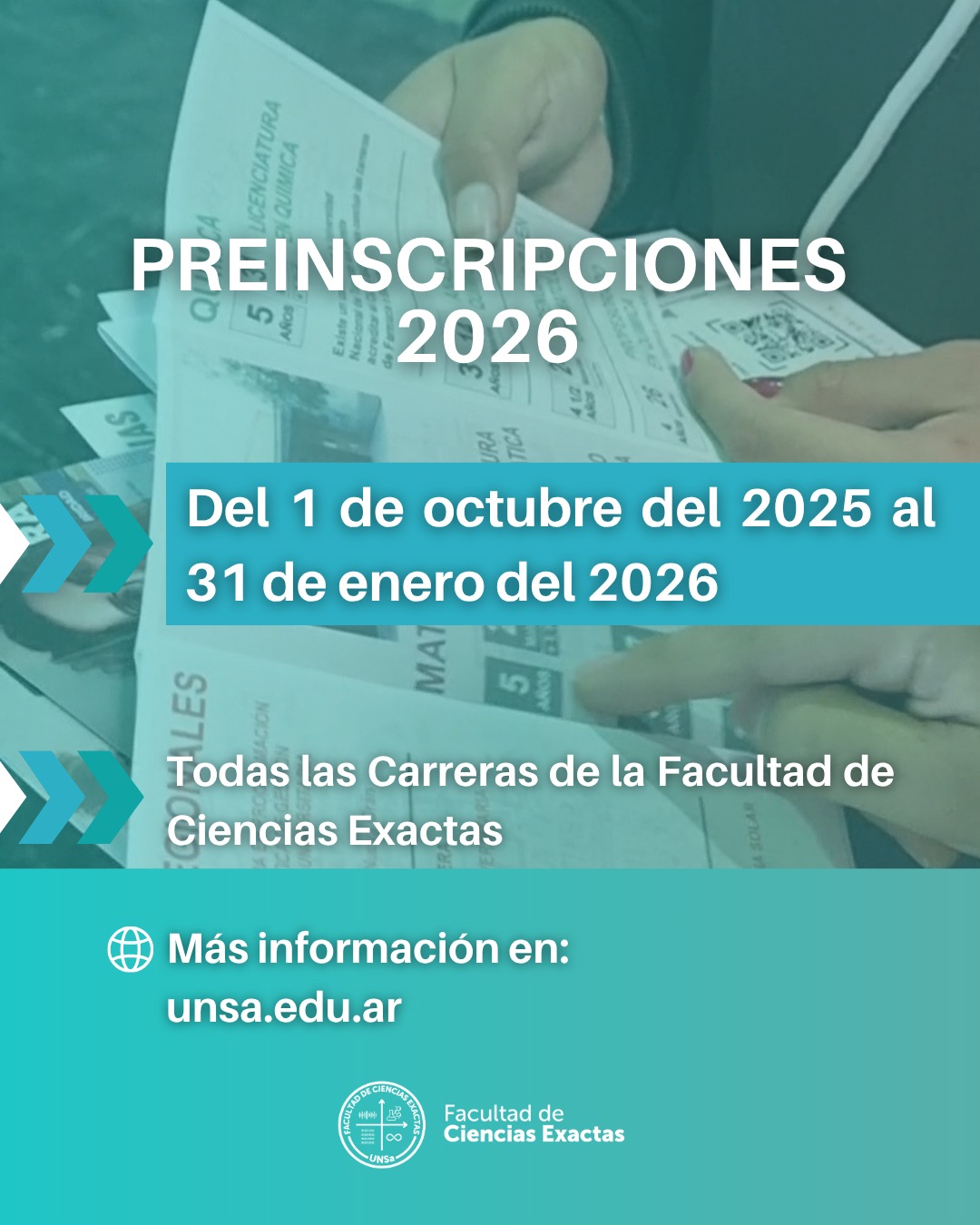 La Facultad de Ciencias Exactas informa que las preinscripciones a todas sus carreras estarán abiertas del 1 de octubre del 2025 al 31 de enero del 2026.